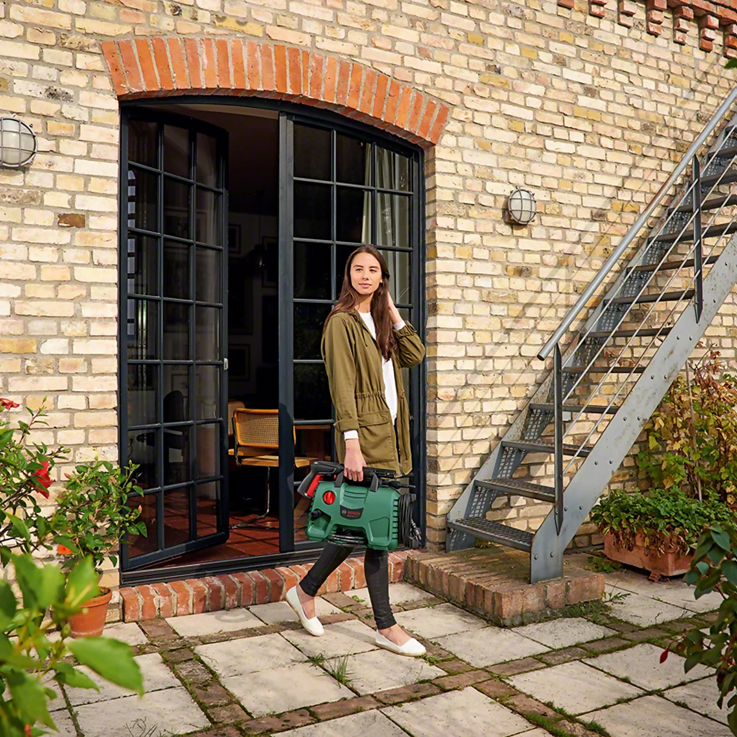 The EasyAquatak 120 offers fast and effortless cleaning performance. This compact high-pressure washer is easy to manoeuvre and store due to its compact design and accessory storage. Cleaning cars, patios, and garden furniture is easy with a 120-bar cleaning power and a choice of Variable Fan Jet and Rotary Nozzles. Its 450-ml High-Pressure Detergent Nozzle reduces cleaning time by applying the soap quickly. Push-fit connections and in-use gun storage make cleaning simple.