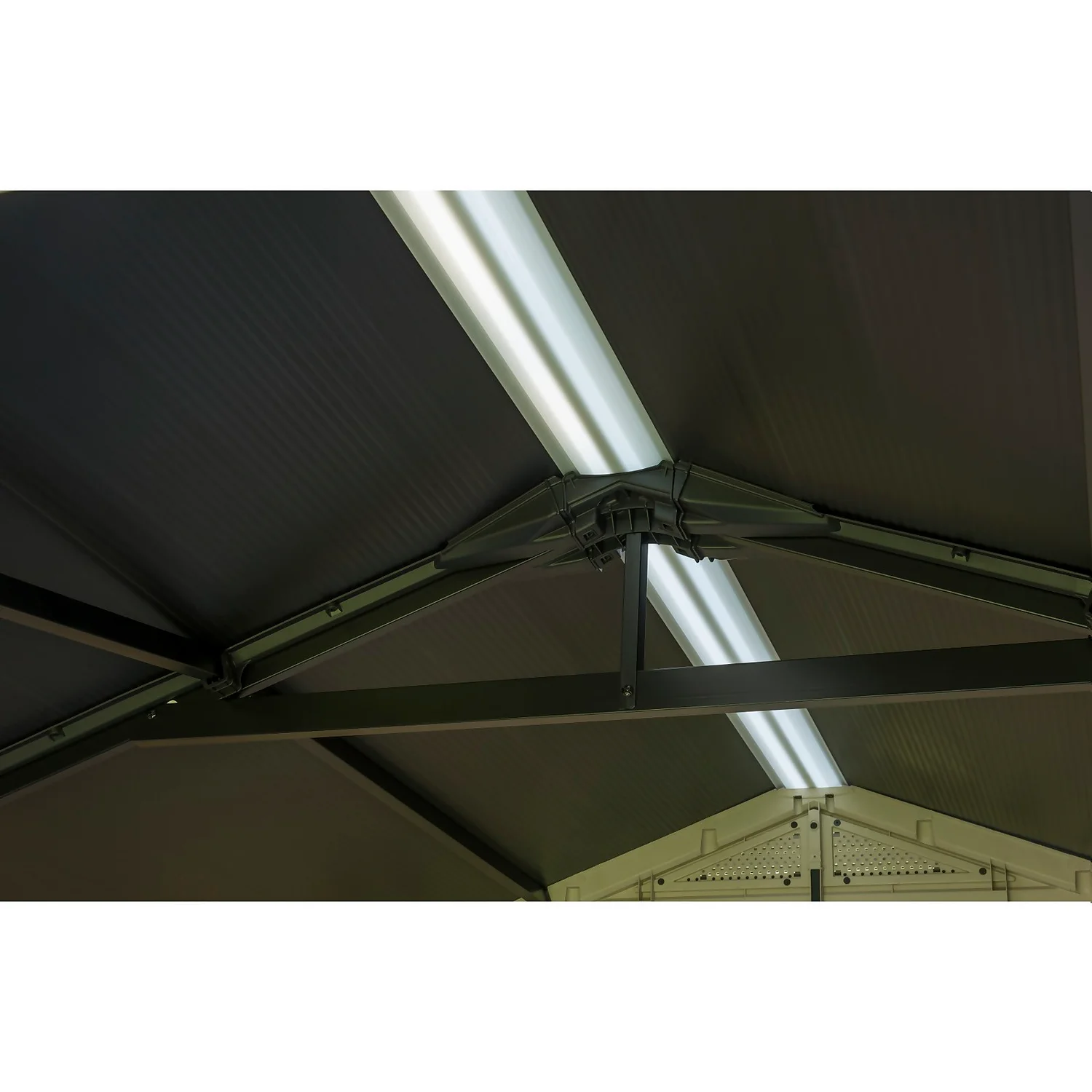 With its elegant wood look effect, the factor 8 x 6ft garden shed is made out of a strong, weather-resistant resin with steel reinforcement and a heavy-duty flooring. Providing an ideal outdoor storage solution as well as creating an elegant feature in any garden, the factor shed also boasts many features including wide double doors with lockable option, a window and skylight, high ceiling with two shelves for off the floor storage space and also comes with built-in ventilation. An elegant yet practical addition to any home and garden with easy assembly. Shed Footprint: 248 x 178 cm.