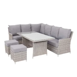 Make al fresco entertaining a delight with the Miri 6 seater outdoor dining set. The slatted table top and woven chair backs and seats will add a touch of contemporary styling to your outdoor seating area. With fixed armrests and backrests you and your guests will be dining in comfort. Made from sustainably sourced wood with steel hardware it’s strong, durable and made to last.