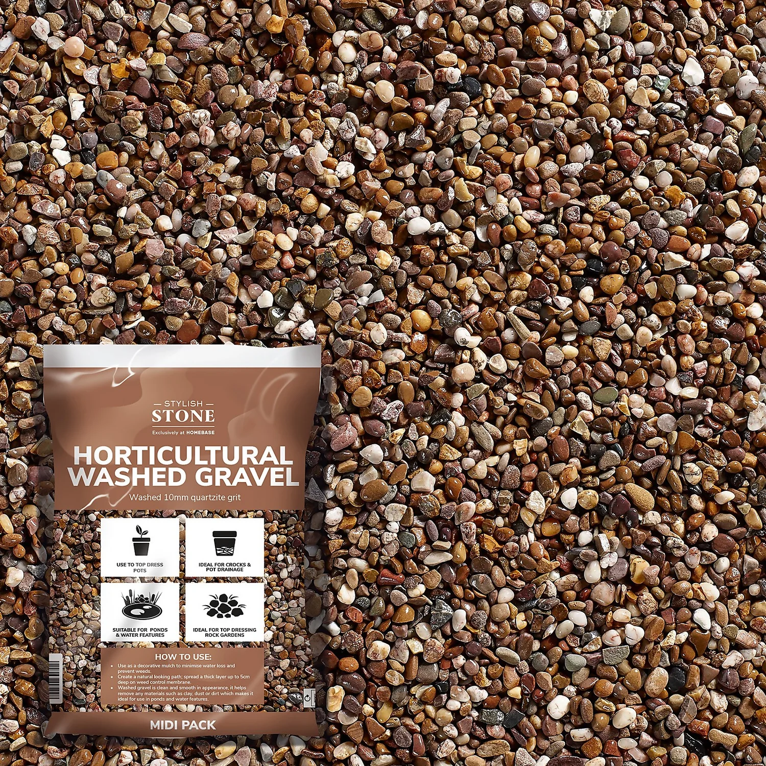 - Use as a decorative mulch to minimise water loss and prevent weeds